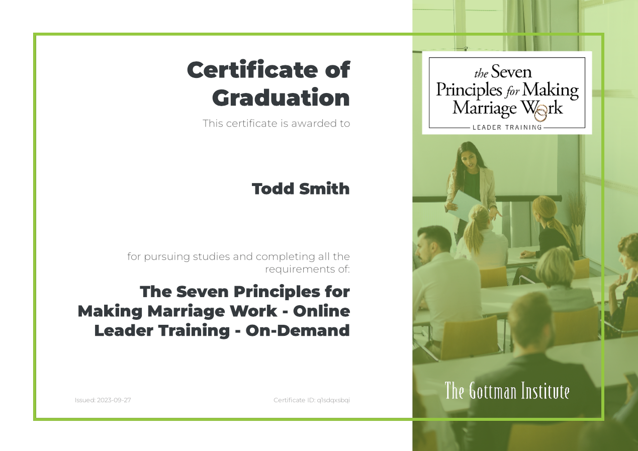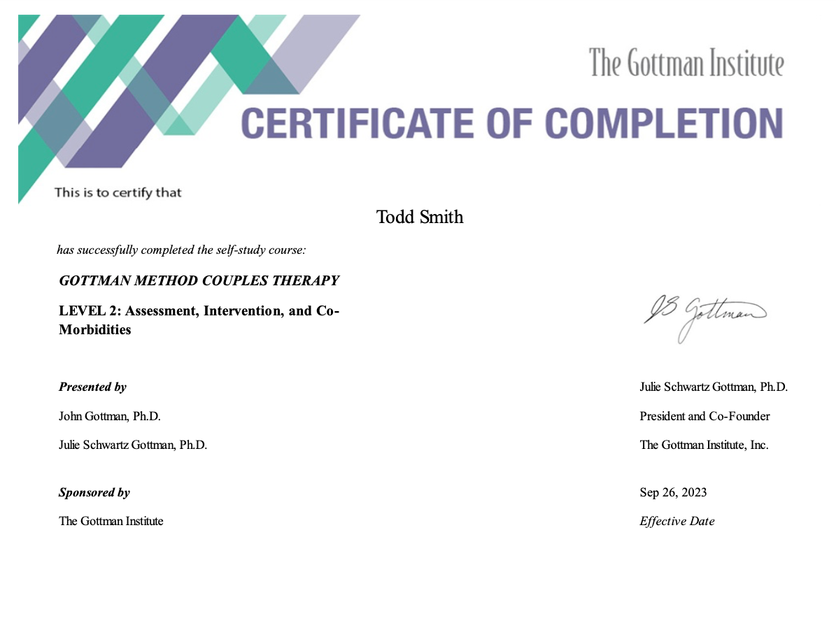 So I went out and sought training and certification in all the latest understandings and research of leading thinkers in the field of marriage and family science, including; Dr. Sue Johnson's work in Attachment Theory, Dr. John Gottman's work on Healthy Happy Relationships, and Harville Hendrix and Helen LaKelly Hunt's work on the concept of Imago Therapy.